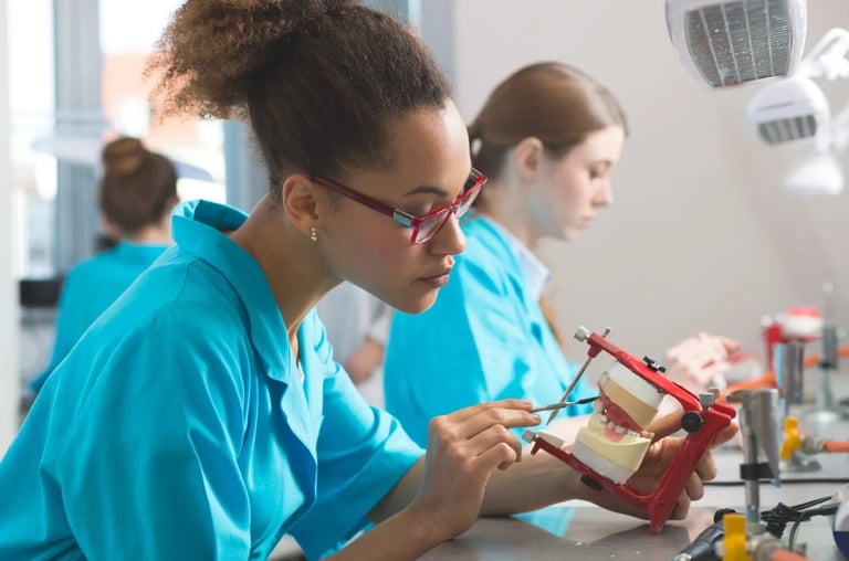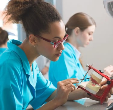 Students explore the technical side of dentistry by learning how to design and fabricate dental prosthetics such as crowns, bridges, and dentures. Training includes digital modeling, materials handling, and precision craftsmanship. This pathway prepares students for entry-level lab positions or further education in dental laboratory technology.